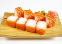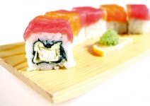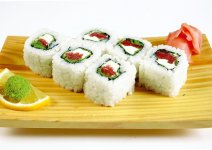 Рис, нори, лосось терияки, сыр филадельфия, огурец, стружка тунца.