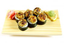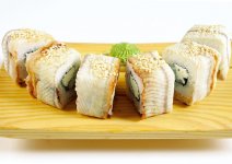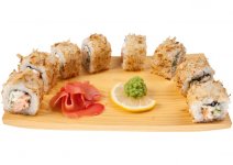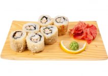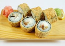 Горячий ролл с рисом, нори, тигровой креветкой, угрем, сыром Филадельфия, в кляре и сухарях темпура.