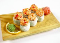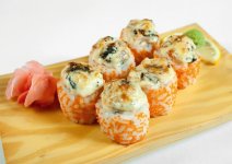 Запеченный ролл из охлажденного лосося и сливочного сыра под шапкой из майонеза, крабового мяса и икры летучей рыбы.