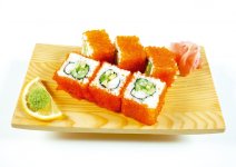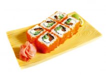 Рис, нори, креветка, огурец, авокадо, тобико.